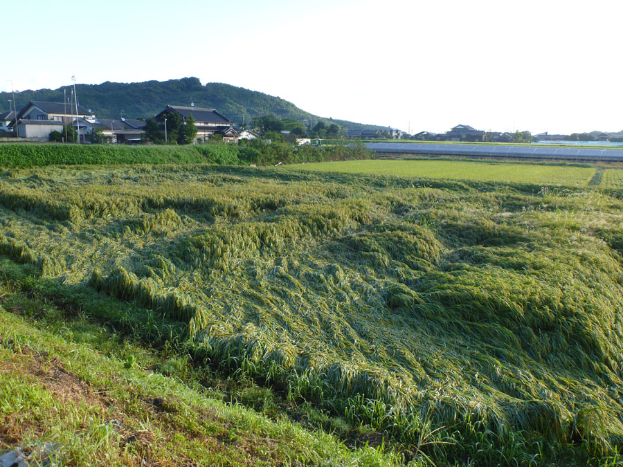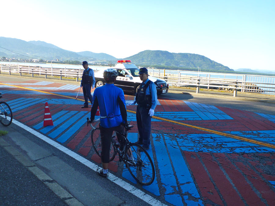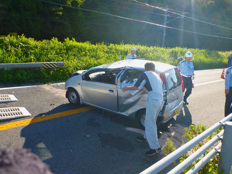 台風の影響でしょうか、水田の稲穂が横倒しになっていました。先頭交代しながら、グングンと快調に進みます。唐津に入る手前、道路をパトカーが封鎖しています。交通事故で電柱が倒れているみたいです。車の走っていない道路をスイスイ約3キロ進むと現場に到着。大破した軽が1台横向きに・・。居眠りでもしたのでしょうか?