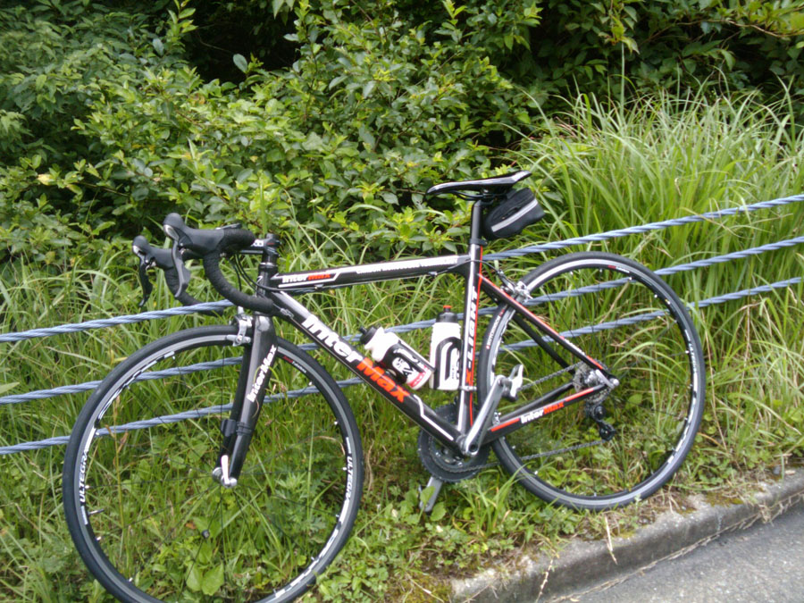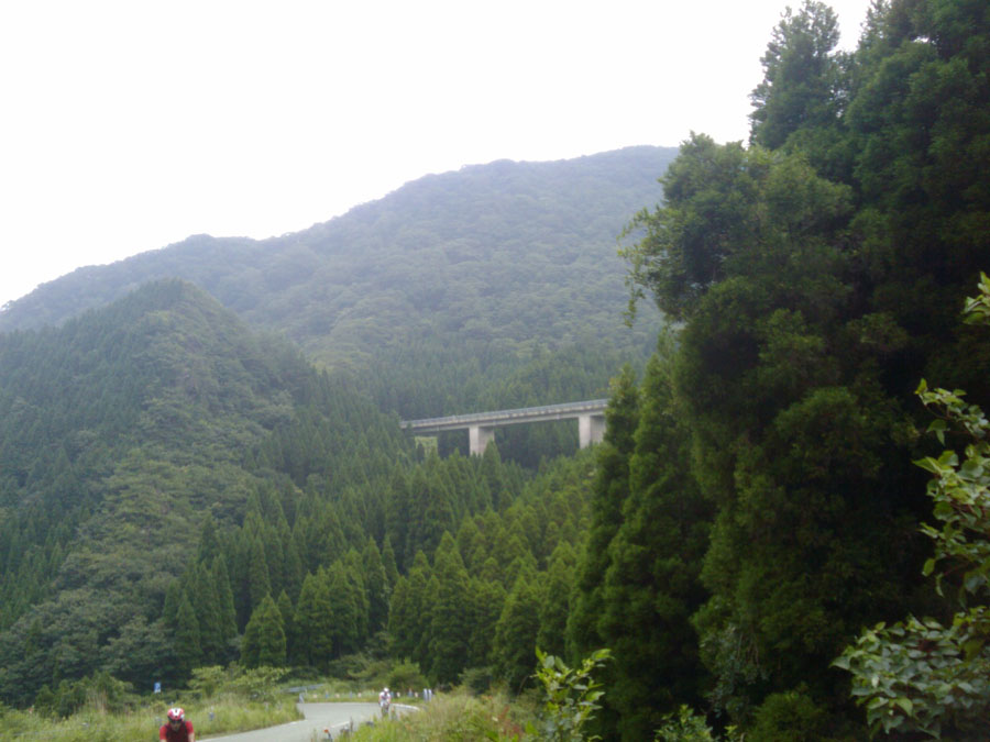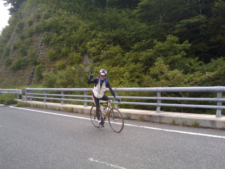 だんだん暑くなってきた登りの中盤、なんと〜〜!!!右足大腿部に強い痙攣。私の伝家の宝刀、”ゆっくりダンシング走法”が使えなくなりました。苦しい修行の始まりです。残りあと90㌔以上あるのに・・・。