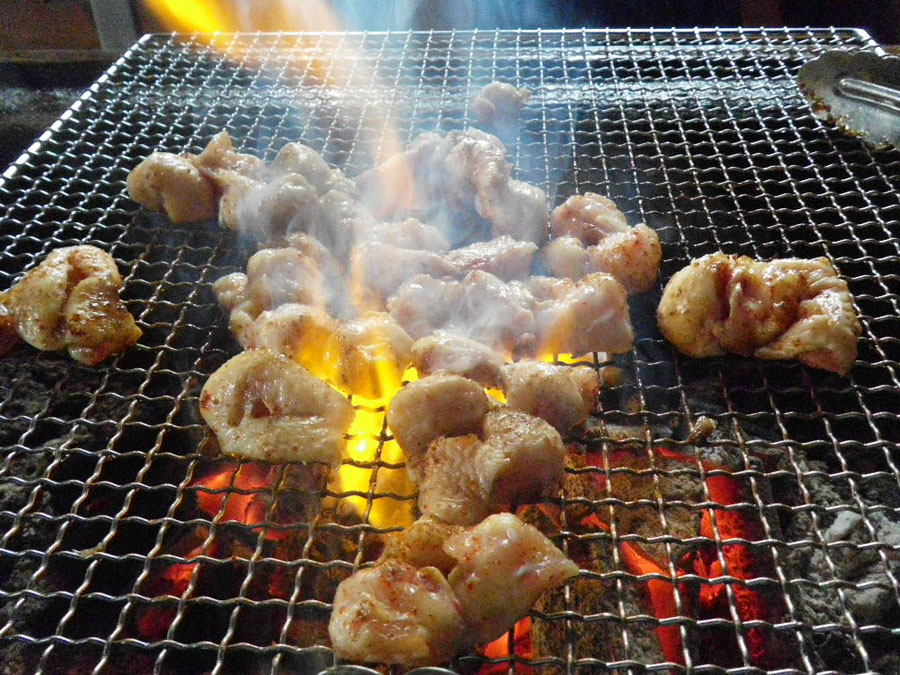 11時に村稀さんに予約をいれてもらって、着いたのがちょっと早かったけど中に入るともう準備万端でした。置き火の炭で焼けた網に肉をのせます。