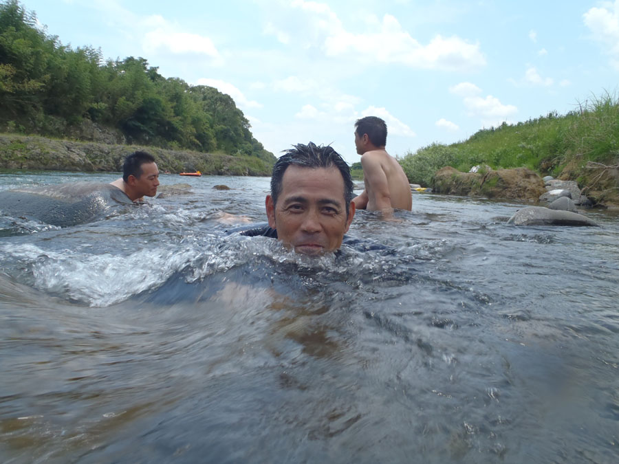 食べた後の矢部川での水浴び、これも最高。帰りは、暑くて何度もコンビニのお世話になりましたが、事故なく無事に家路に、参加の皆様お疲れ様でした。