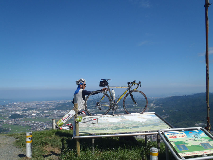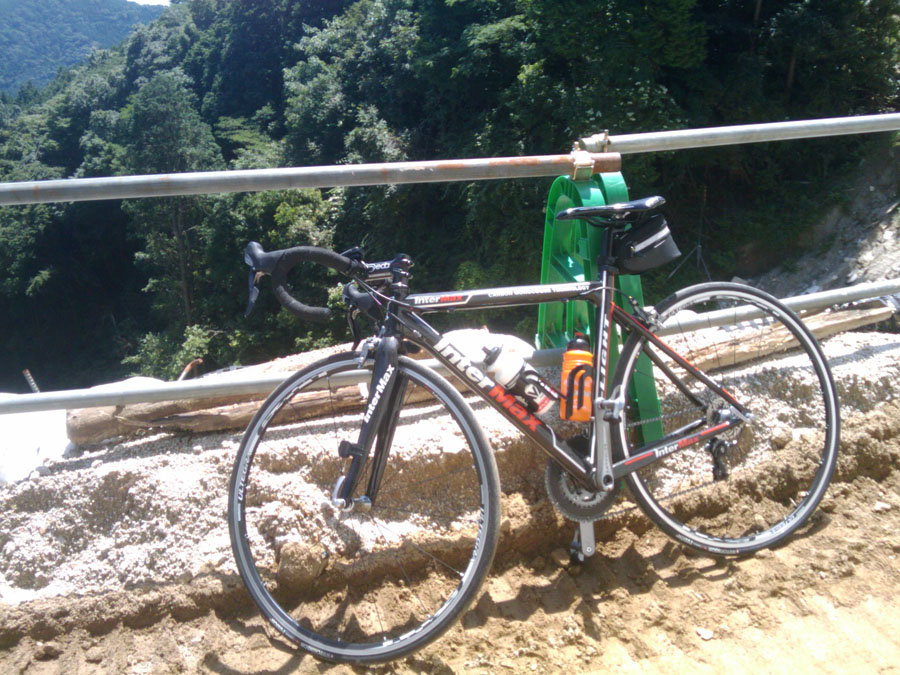 ここからの山頂までは、標高差約160m, 行程約2000m, コンクリート簡易舗装・平均斜度 8%・数十メートルおきに幅20cmほどの導水溝が道路を横断しタイヤ・ホイールをいじめる、つらい行程です。yamamen さんに「力を使わないダンシング」を習いながらも、なかなか実践できず、何度も足をつき、やっとの思いで登りました。