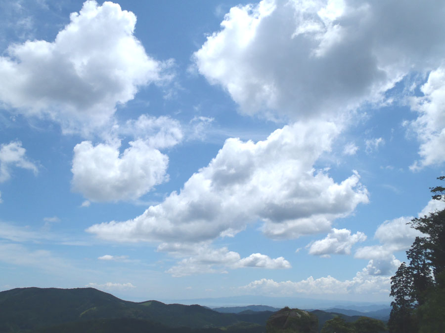 山頂から見下ろす風景は、北方向広角に視野を遮るものなく、わずかな夏雲に、紺青の空、さわやかな風、太陽に近づいているにもかかわらず陽光は優しく、登坂の苦労が報われました。