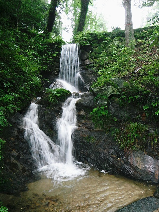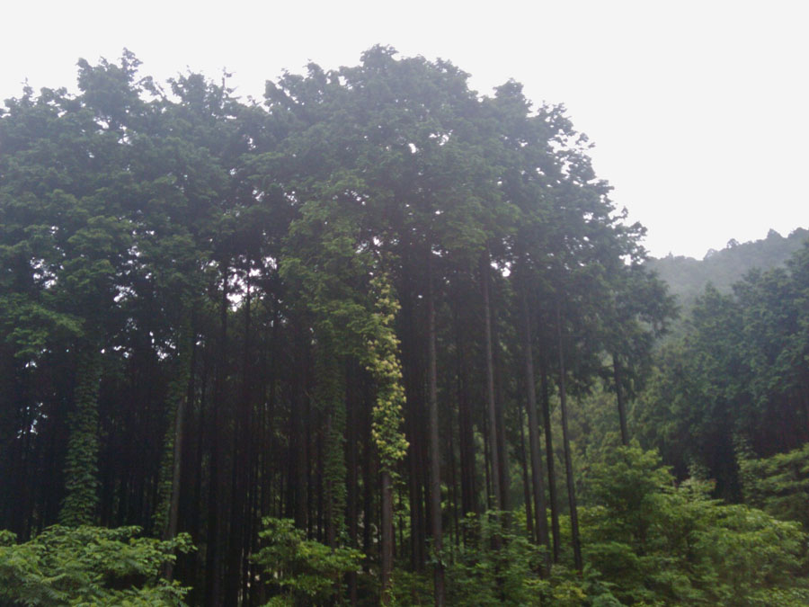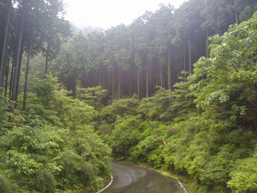 それから小笠木峠を経由して椎原方面へ。霧雨の中、板屋峠を目指します。第5カーブくらいにある分岐点からいつもと違う道を進みます。杉や檜の立派な木立を抜けて第17カーブあたりでいつもの道に合流。 程なく、板屋峠に到着。ここから那珂川町方面へ下ります。