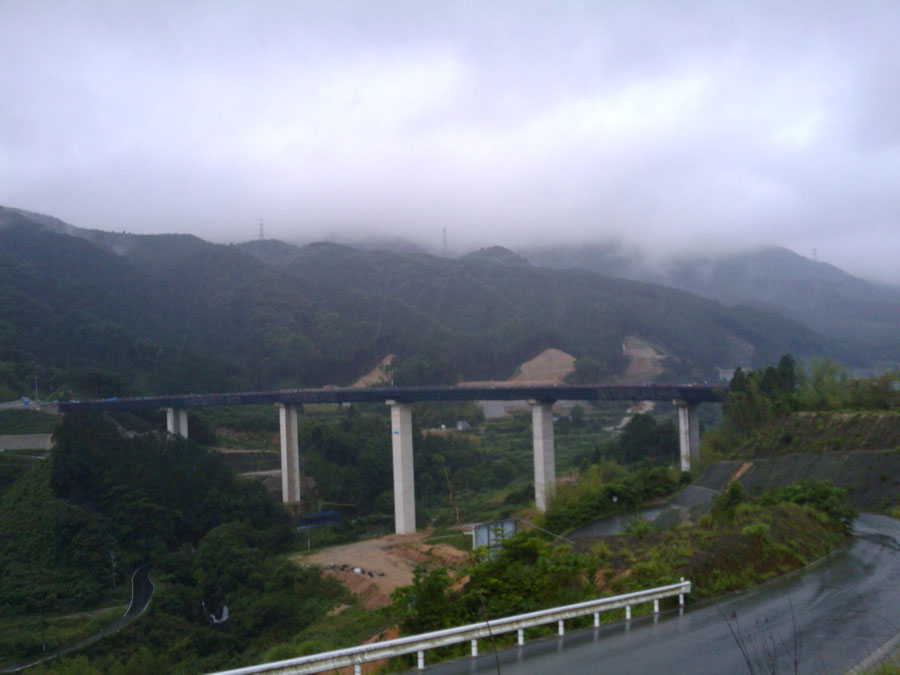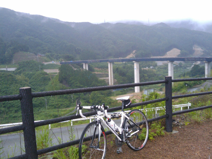 少しずつ雨が強くなります。と、下からローディーの集団が登ってきます。自分達だけじゃないと思うと少し嬉しいですね。夫婦杉を横目に、国道385号へ合流。と、坂の匂いを嗅ぎ付けた村稀さんが五ヶ山ダム工事現場の所へナビゲート。日曜日で警備の人がいないのを幸い、封鎖ゲートの隙間から失礼しま〜す。(ごめんなさい)