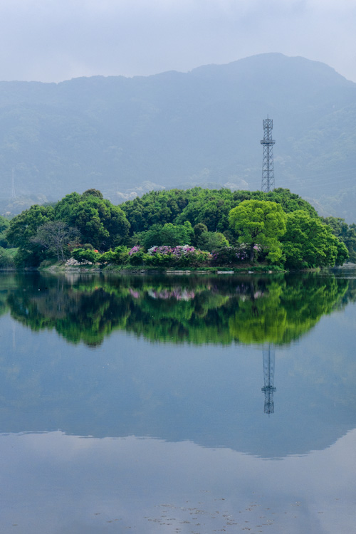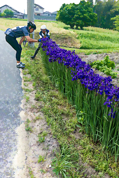 太宰府市・南東端の「高雄交差点」からのルートが素晴らしい。 多数の車・トラックが行き交う国道386号線を避け、旧街道(であったと思われる道)を進みます。道路は我々の独占状態。聞こえるのは鳥のさえずりとラチェット音だけ。(本来は避けるべき)3列併走も可能。話をしながら進み、ときおり足を止め、花を愛で・水面に反射する風景を眺めます。