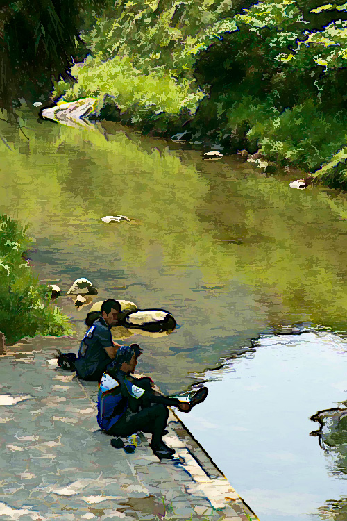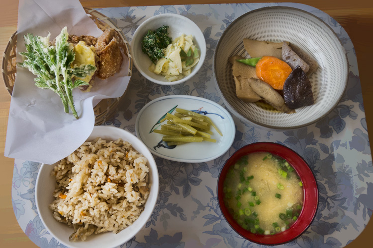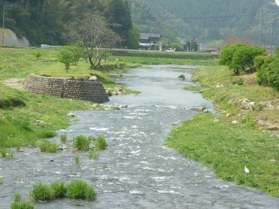 昼食開始30分前に到着。かなり暑かったので、目前の川に飛び込もうか?、などと話しておりましたが、とんでもない。川の水はたいへん冷とうございました。人気の山菜ランチバイキングは第1日曜日のみ。しかし、通常の6品ランチで十分な量・おいしさでした。猪肉の料理もあるそうです。食堂は60人の(むさ苦しい)九大生であふれ、我々は片隅で小さくなっ