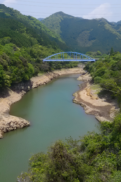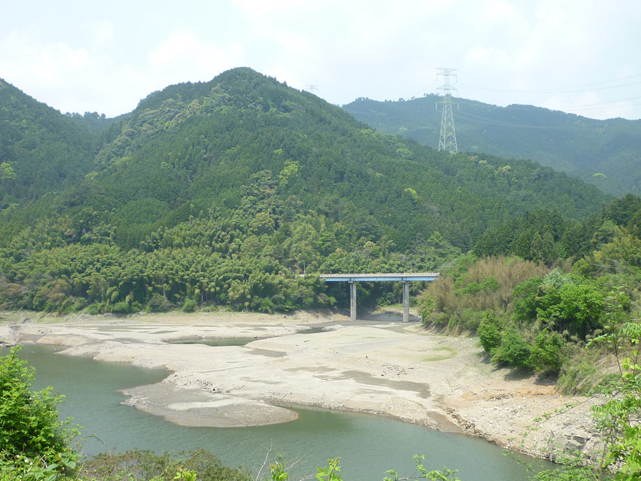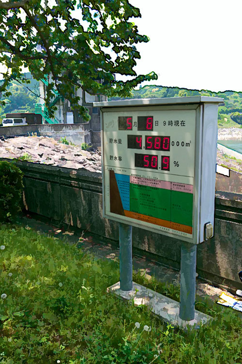 寺内ダムに行けば「渇水を視認し、節水の意識が高まる」つもりでおりました。東側に広がるダム湖は「美奈宜湖」と言うそうです、良い名称ですが、地元の人以外は知らないでしょうね。ダム施設の表示によると貯水率 50.9%、もっともっと低いと思っていた私は不謹慎にも拍子抜けしました。