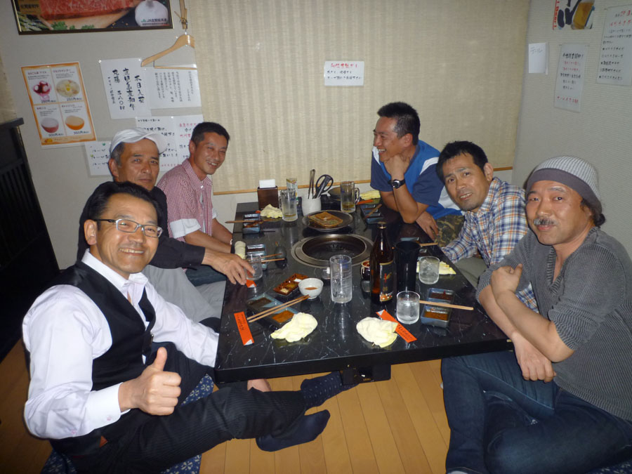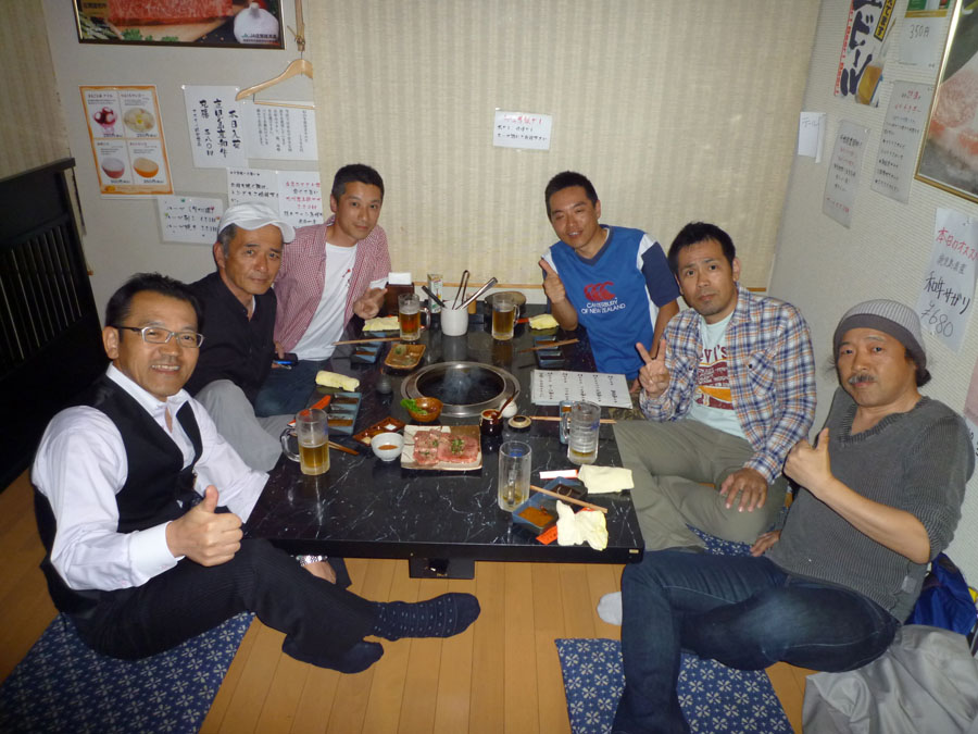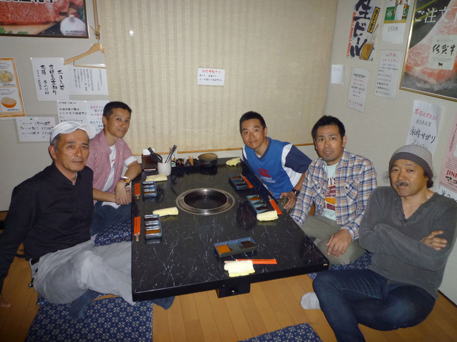 国東をそれぞれに戦い抜いた野郎たちの打ち上げの場には、美味い肉が欠かせない。固い団結で、それぞれが目標設定、国東を目指した仲間たち。今日7日あるのはやわらかなムードだけ!まっこちさん、イケさん、グレッグおかぽんさん、スマイリーさん、Imai さん、そして村稀の計6名。大いに飲みかつ喰らい、国東の感動を語った。(本当は皆食べるのに忙殺されていただけ)