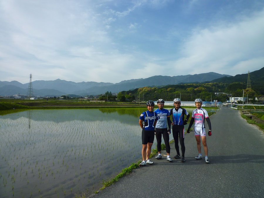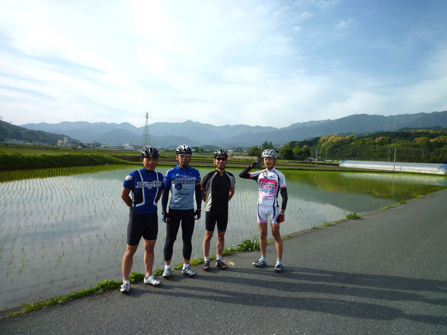 早良の田園地帯、いつの間にやら田植えの済んだ水田が点在。景色を映し込んだ水面を見るのは楽しいものです。三瀬への登り起点内野で、スマイリーさん、小笠木峠を目指すべく離脱。ご苦労様!