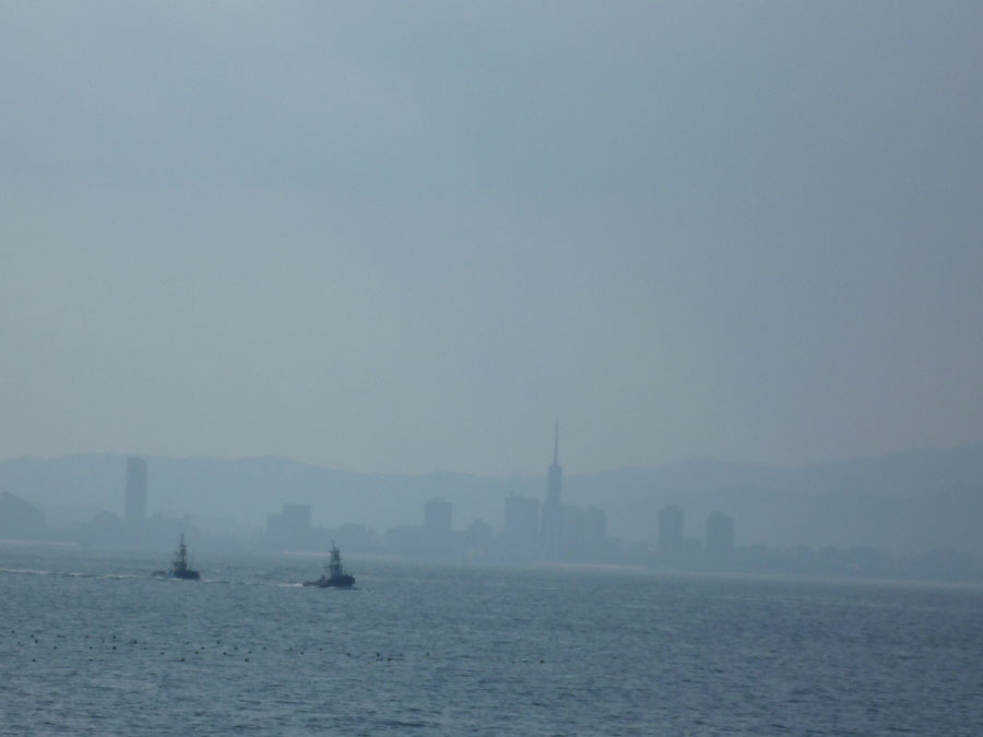 遠く望む福岡タワーは、朝靄の中で幻想的です。