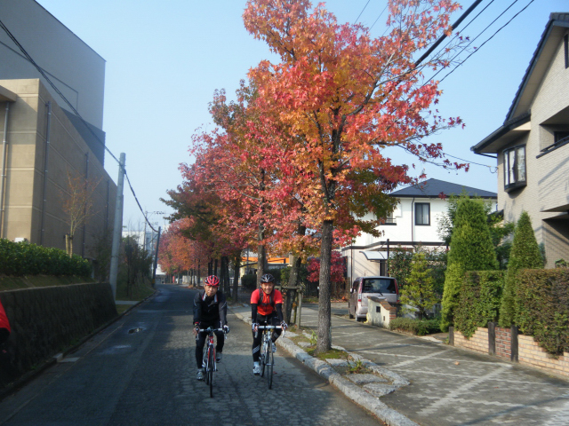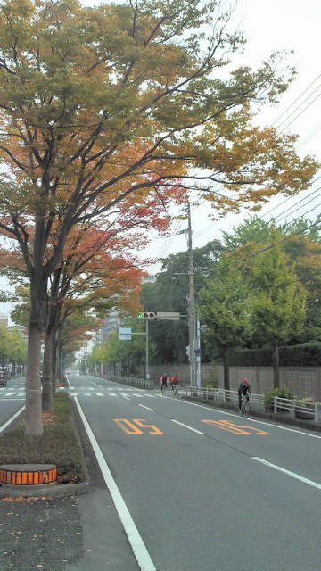 9時過ぎには早くも久留米通過。そして大谷短期大学付近で紅葉が綺麗な道をM上さんが発見し、みんなで写真撮影会。