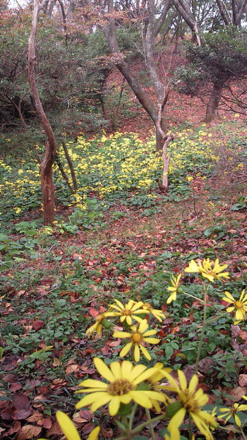 そこから左折すると、すぐに井野山登り口です。自動車はここからは進入禁 止。自転車と登山者だけです。落ち葉が濡れて滑りやすい路面に注意しながら、ゆっくりと、過ぎゆく秋を楽しみながら(かっこつけすぎ?) まったりと登りました。2キロくらい登ったでしょうか?自転車を止め、階段を登った先には、360度の大パノラマが広がっていました。福岡の市街地が一望です。少しもやっていましたが、この眺めは素晴らしいの一言。まだ、登ってない方には絶対お奨めです。