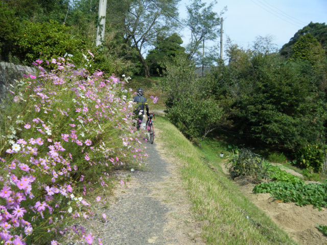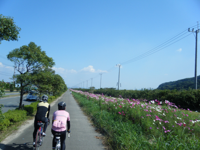 地図を頼りに、海岸線沿いに素敵なコスモスのラインを発見。