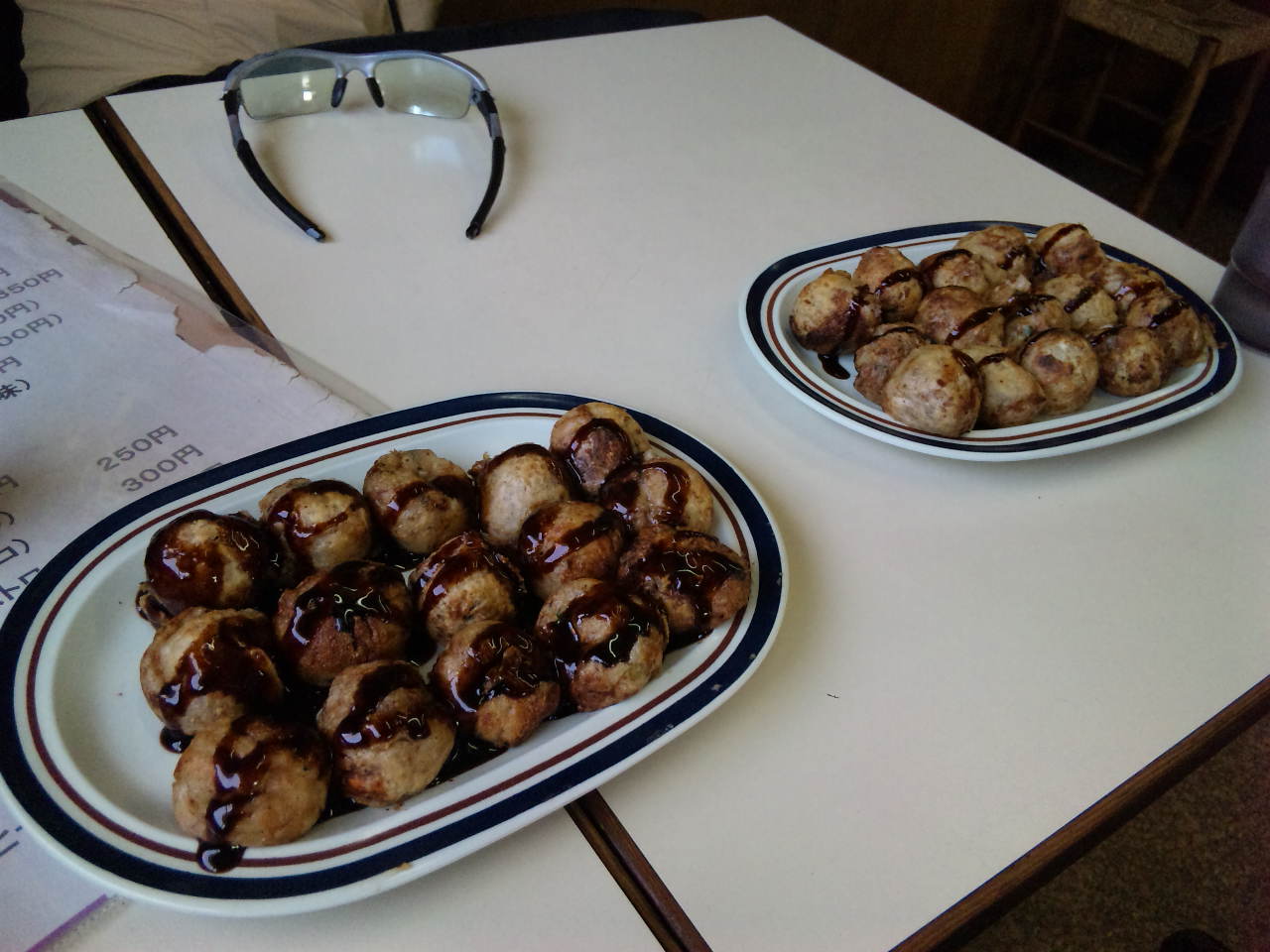 次に渡船場に向かい、若松駅前の「とらや」にて休憩。ここは、饅頭が有名ですが、あえて、私たちは、たこ焼きにお好み焼きを注文します。なかなかレトロな雰囲気充満で、くつろぎました。