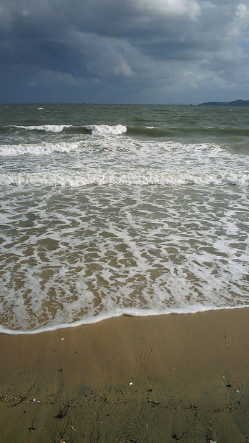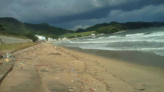 途中立ち寄った大原海水浴場。砂浜はゴミの山、M上さん携帯でカシャ!